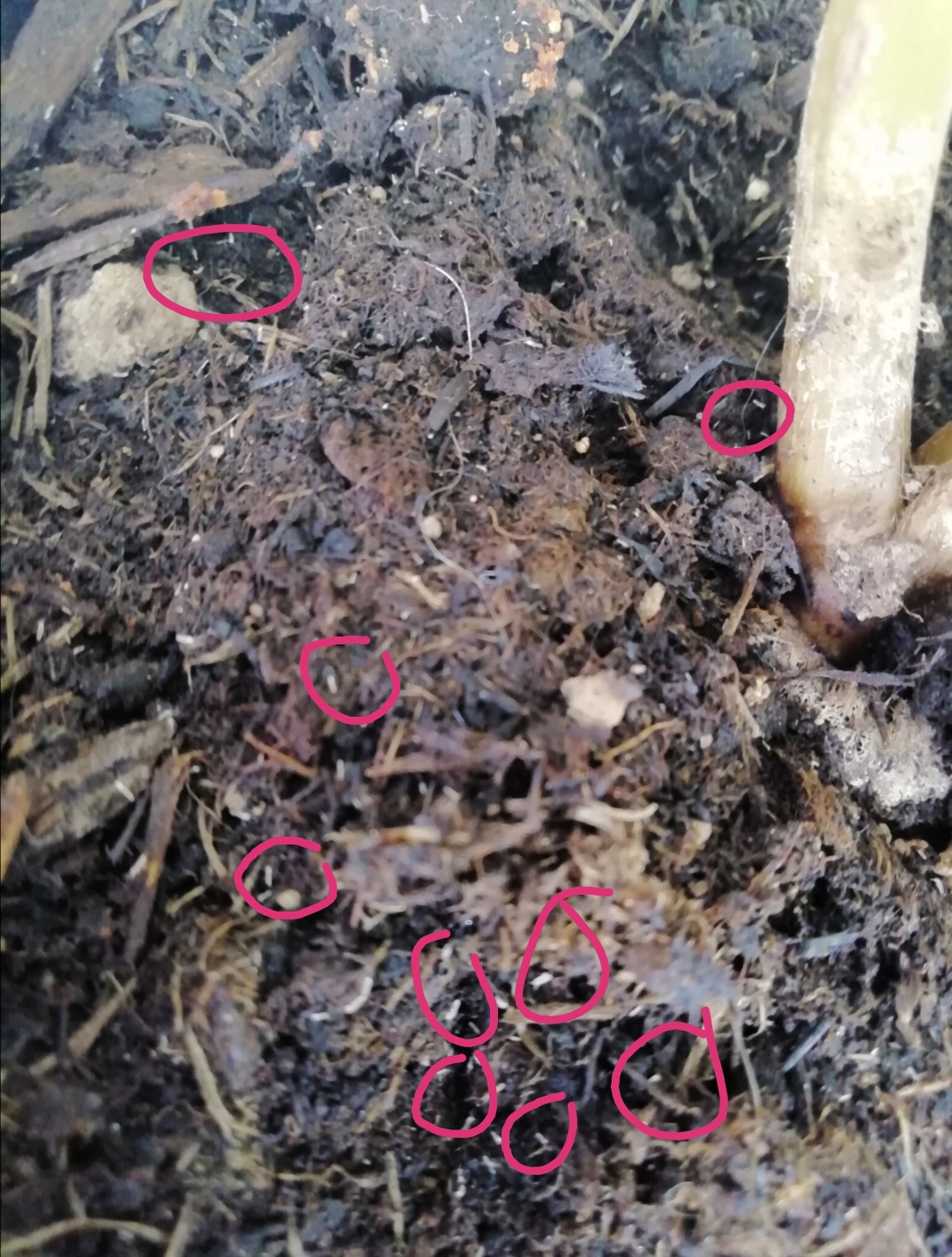 Peut-être des larves de Sciarides (mouches du terreau). Se plaisent dans les sols qui restent trop mouillés trop longtemps. Toujours laisser sécher à hauteur d'un doigt, surtout en hiver. Par la suite, en cas d'infestation (moucherons qui volent en nombre autour des plantes), envelopper le pot dans une moustiquaire ou du tulle noué autour du pied de la plante, pour les empêcher de pondre dans le substrat, mais normalement si on gère les arrosages elles ne viennent plus (une ou deux de temps en temps, sans conséquence).