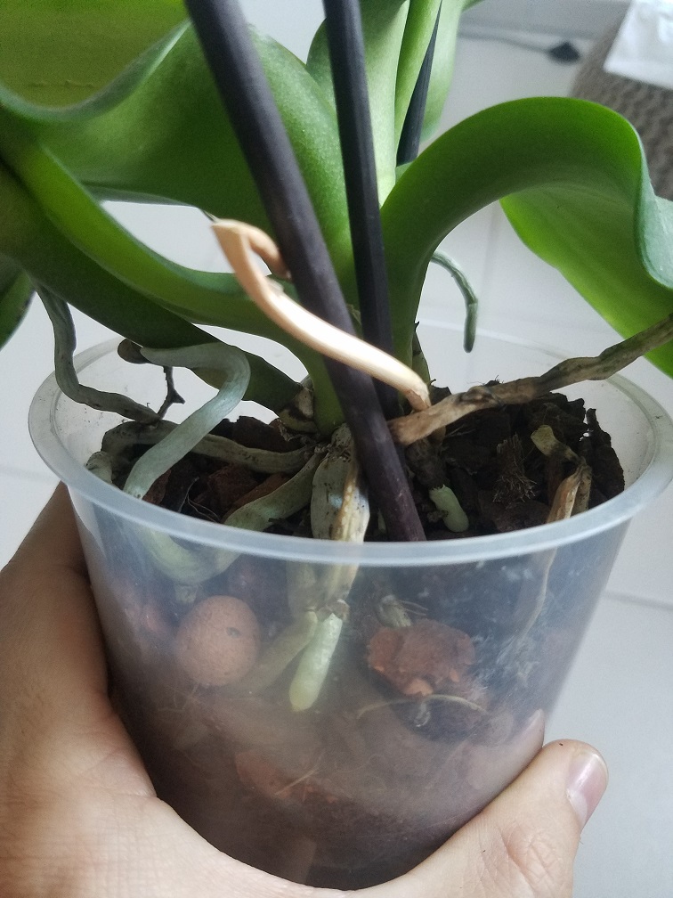 Elle a l'air d'aller assez bien dans l'ensemble mais ses feuilles sont un peu ramollo, ses arrosages ne sont pas assez fréquents. Ca se confirme avec les racines, belles pour la plupart mais pas assez nombreuses (quelques unes sont fripées ou carrément desséchées).