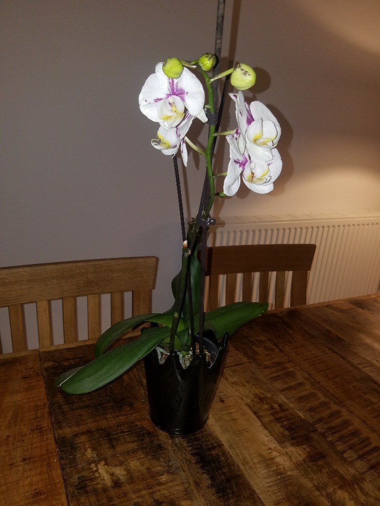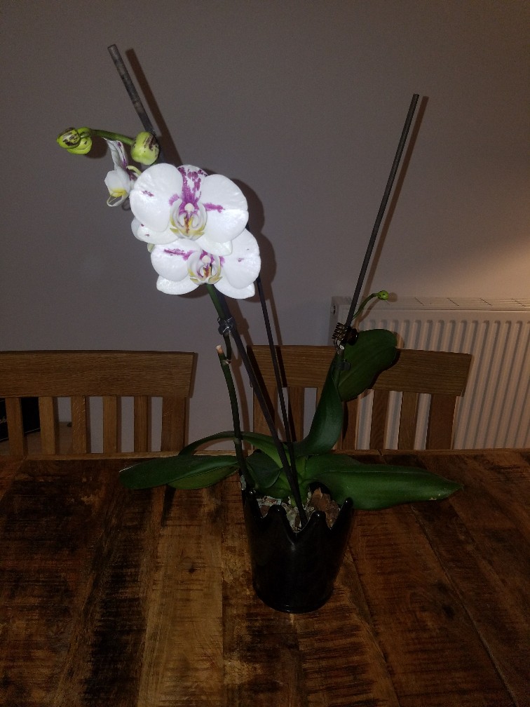 Je reviens donner quelques nouvelles. J'ai rapproché l'orchidée de la fenêtre, mis de l'engrais et placé un verre d'eau juste à côté du pot. De nombreuses fleurs sont en formation, il n'y a plus qu'à attendre qu'elles sortent !