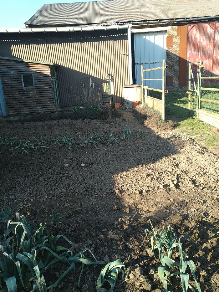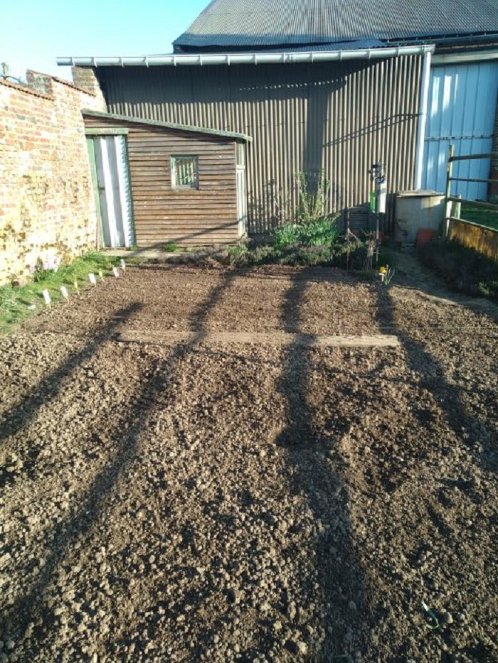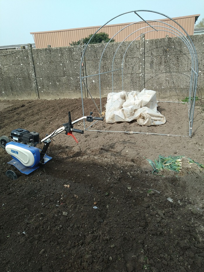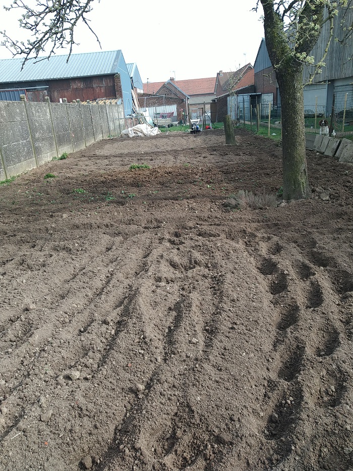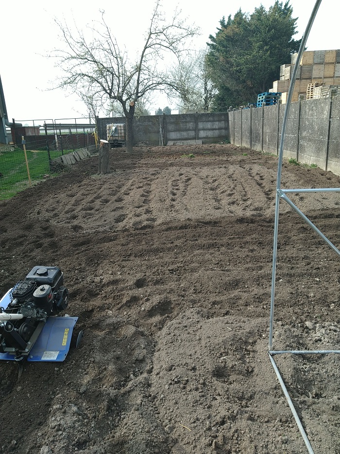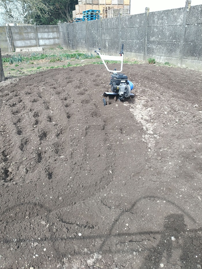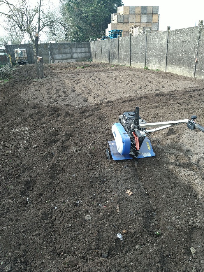 Aujourd'hui au potager bis , gros coup de motobineuse avant un fraisage de finition et séchage de la terre .en attente pour quelque pommes de terre, échalotte, petit pois