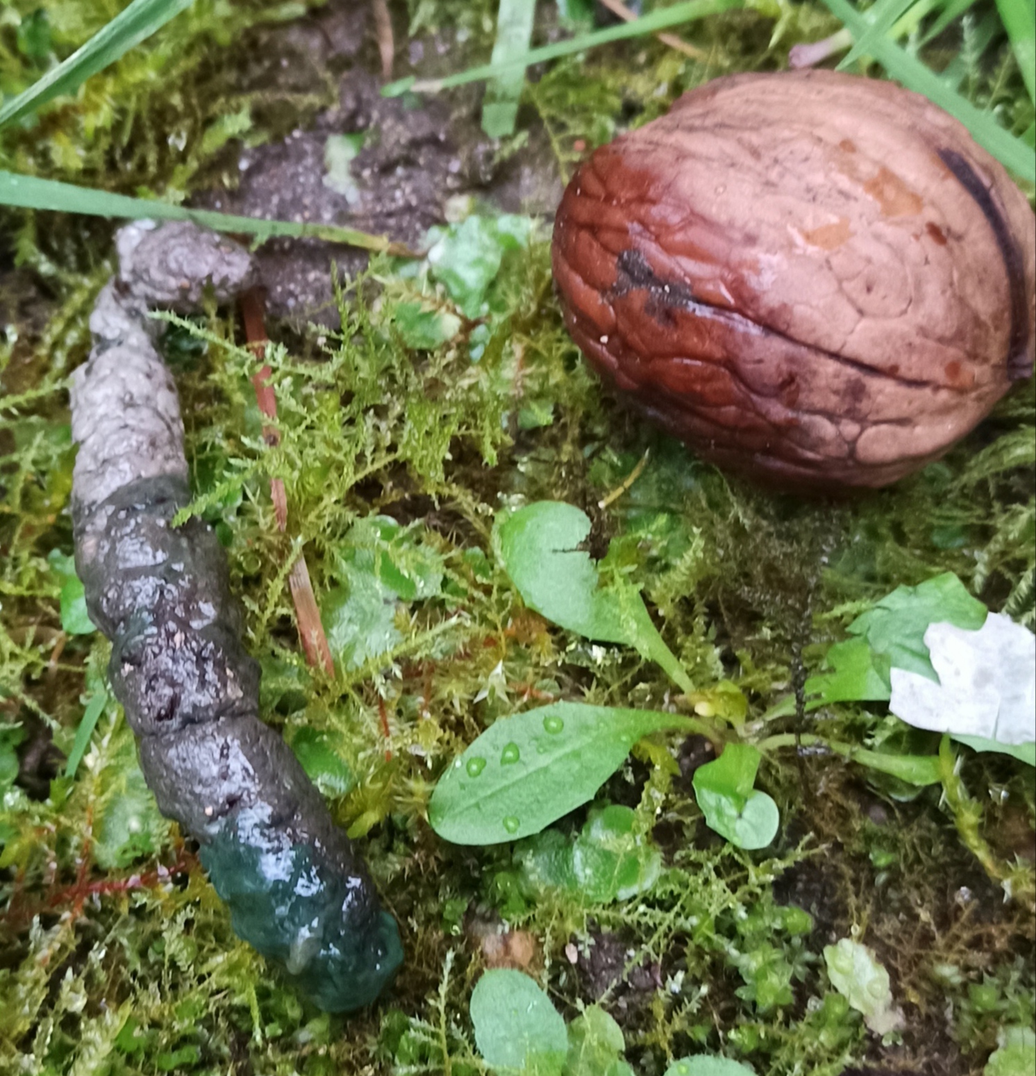 Oui, les étrons au même endroit, pour le blaireau, c’est le roi de la propreté en faisant un « pot ». Avant de faire tes photos scatologiques du chat de ton voisin, n’oublie pas le pied à coulisse pour faire des mesures, longueur, diamètre. Dans le cas présent, c’est la taille par rapport à la noix qui me fait penser à hérisson.