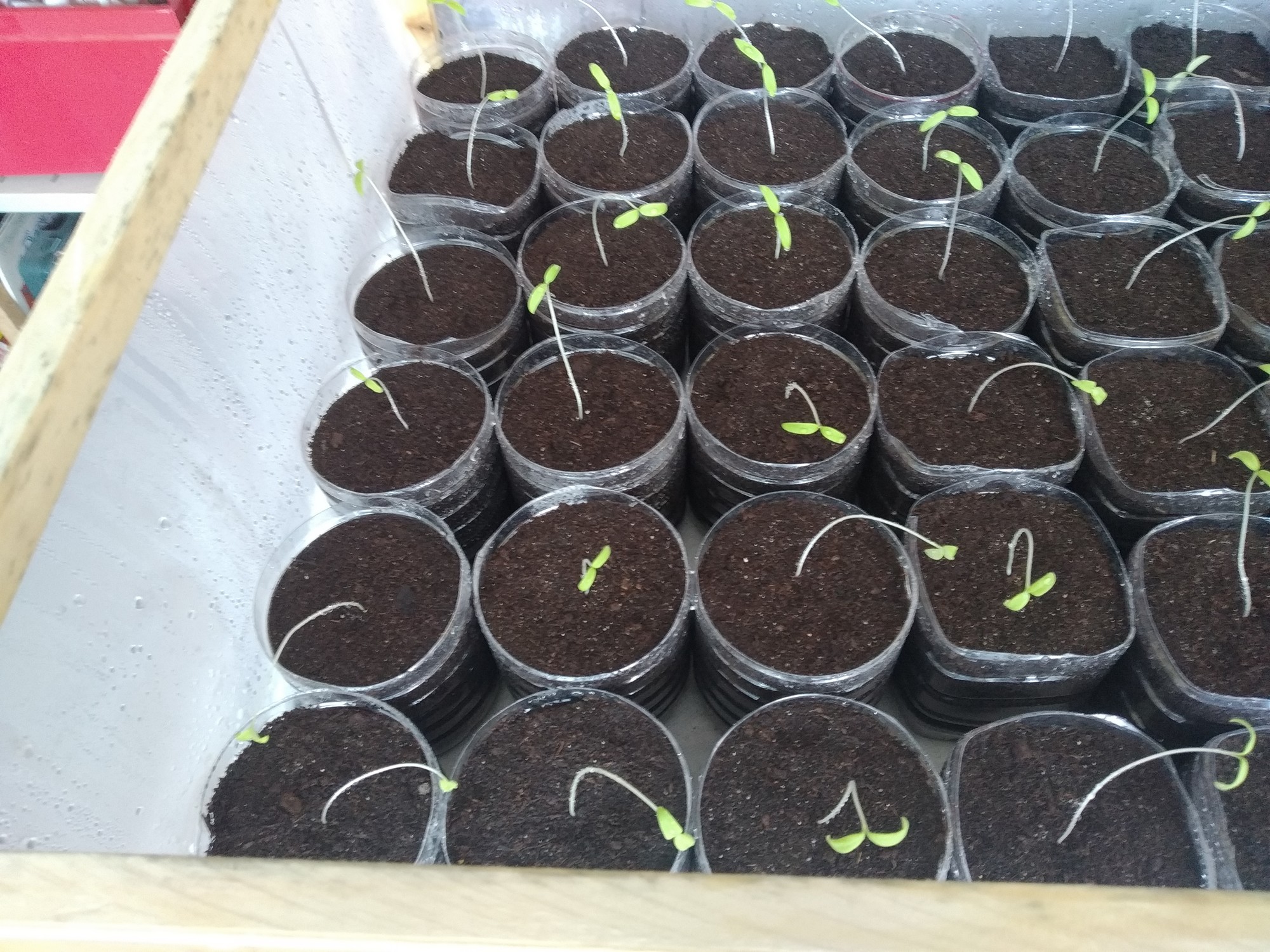 Semé sous cloche sans lumière artificielle. Un pied à germé 24h avant les autres. J'ai attendu que les autres germent pour installer la lumière artificielle. Le germe du premier (qui est resté 24h sans lumière artificielle) est deux fois plus grand que les autres et moins vigoureux !