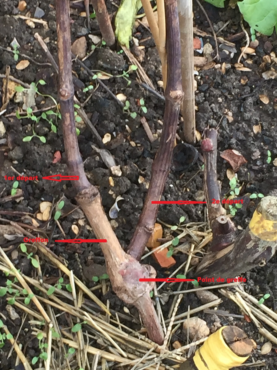 Hello les jardineux !!! Après la reprise de la greffe en oméga effectuée de l'an dernier (greffon à deux yeux), je me suis retrouvé avec deux gros départs hyper vigoureux et mesurant plus de 3 mètres chacun ... Je souhaite palisser cette vigne (PG américain) sur un fil et la conduire en cordon de Royat. Les deux cordons ont un gros diamètre, je pense les conserver tout en les réduisant à moins d'un mètre de longueur. Regardez ...
