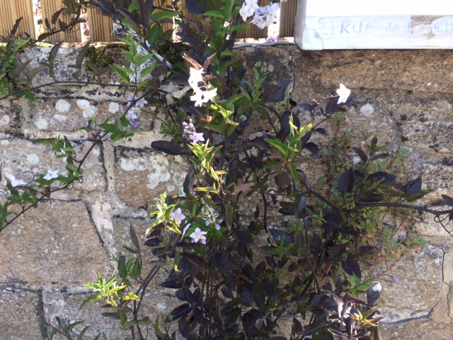 Une grimpante, sans souci, en fleur quasi toute l'année.