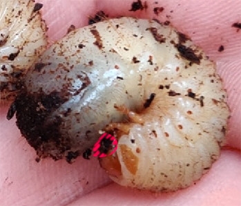 Dans le cas présent, j’ai repris la photographie. Nous pouvons observer une ligne de points orangés. Je pense qu’elle n’est pas présente chez la larve du ou des divers hannetons.