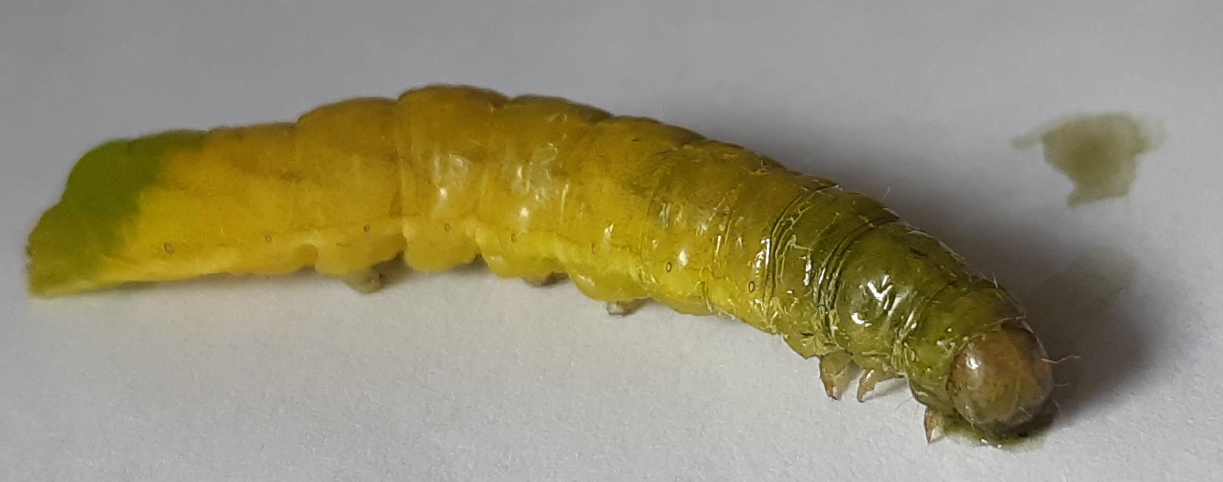 Je cherche à identifier cette chenille jaune vert, trouvée par terre près du primeur de légumes (Centre, Indre-et-Loire ; il vend des choux, salades, carottes, poireaux… pas de fruits). :paix: