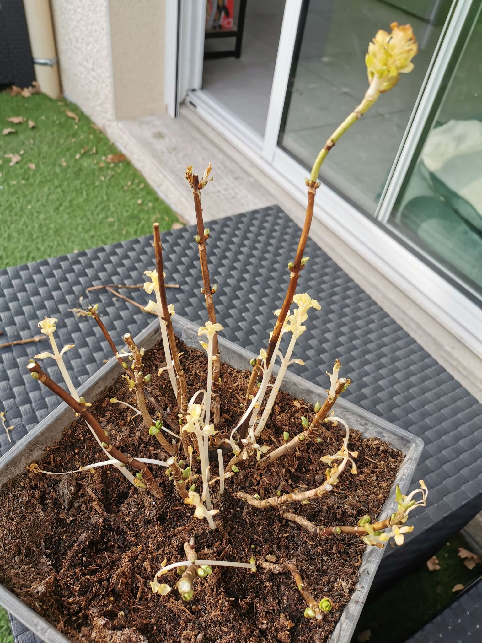Pour les autres, tailler au-dessus des gros bourgeons, sans tarder et lui donner un peu d'engrais pour plantes fleuries ou hortensias.