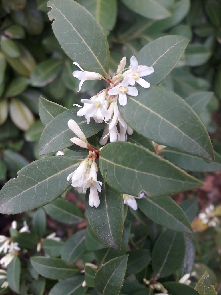 Les feuilles sont persistantes, elles ont l'air opposées très légèrement dentées, environ 5cm. Les feuilles sont petites (moins d'1cm) groupées aux aisselles des feuilles. Et le buisson fait 1m.