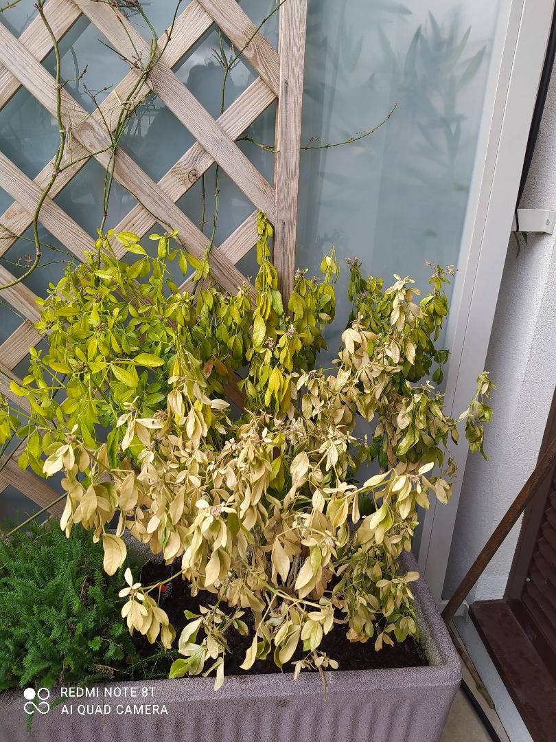 une telle plante serait mieux en pleine terre J'en ai un chez moi ,en pleine terre près d'un mur ans une des régions les plus froides de France et souvent il a cette allure au printemps... mais il survit!