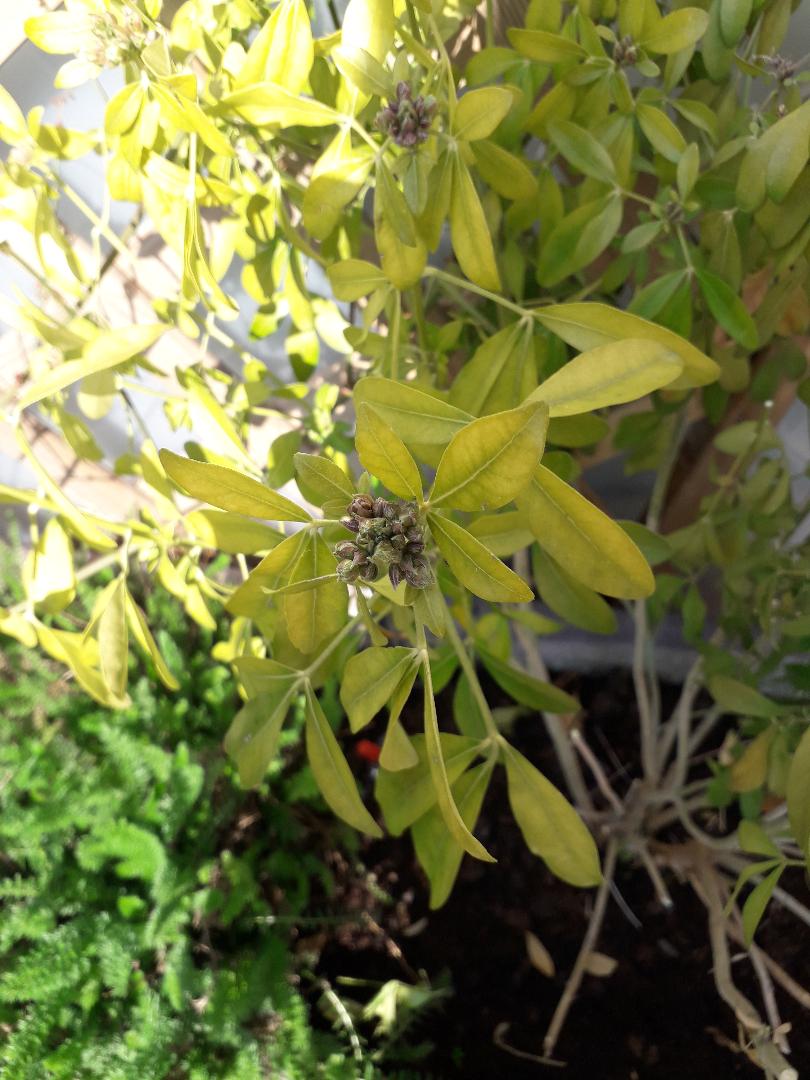 Mon oranger du Mexique est dans un grand bac. Je trouve qu'il a une tête bizarre, qu'il fait la tête...