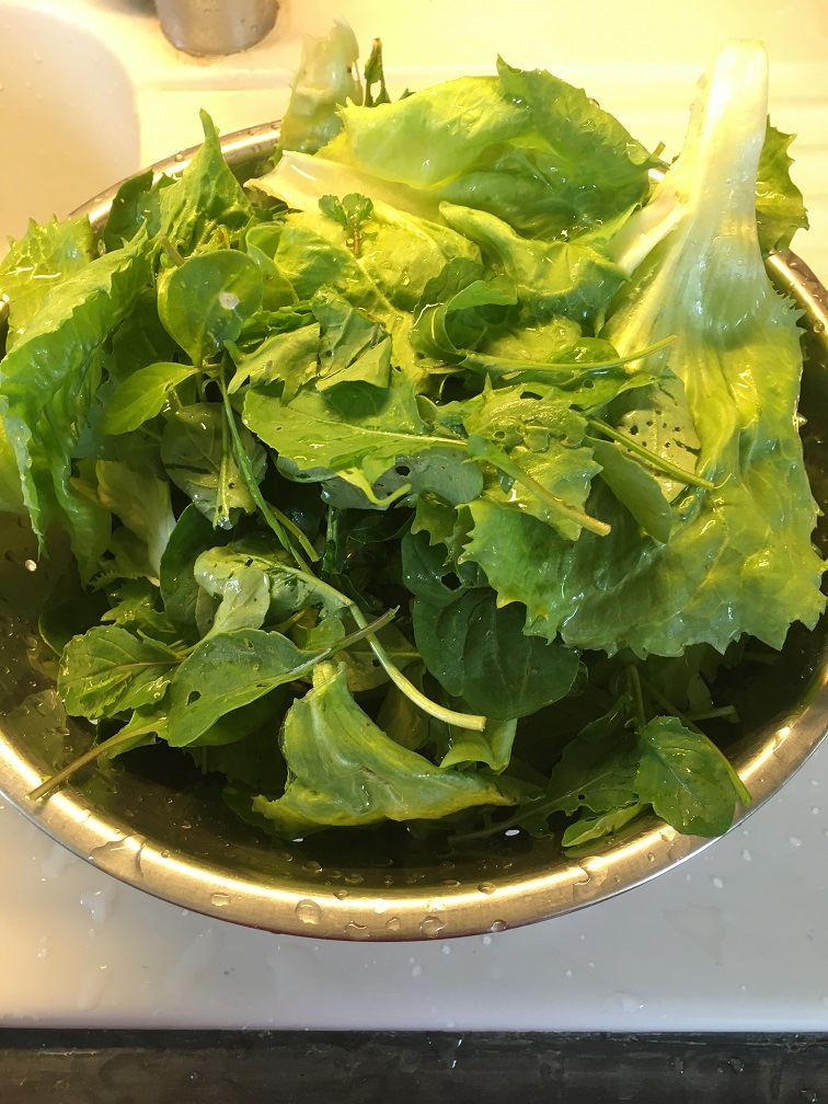 Ramassé un beau saladier de jeunes pousses variées : scarole + roquette + mizuna.