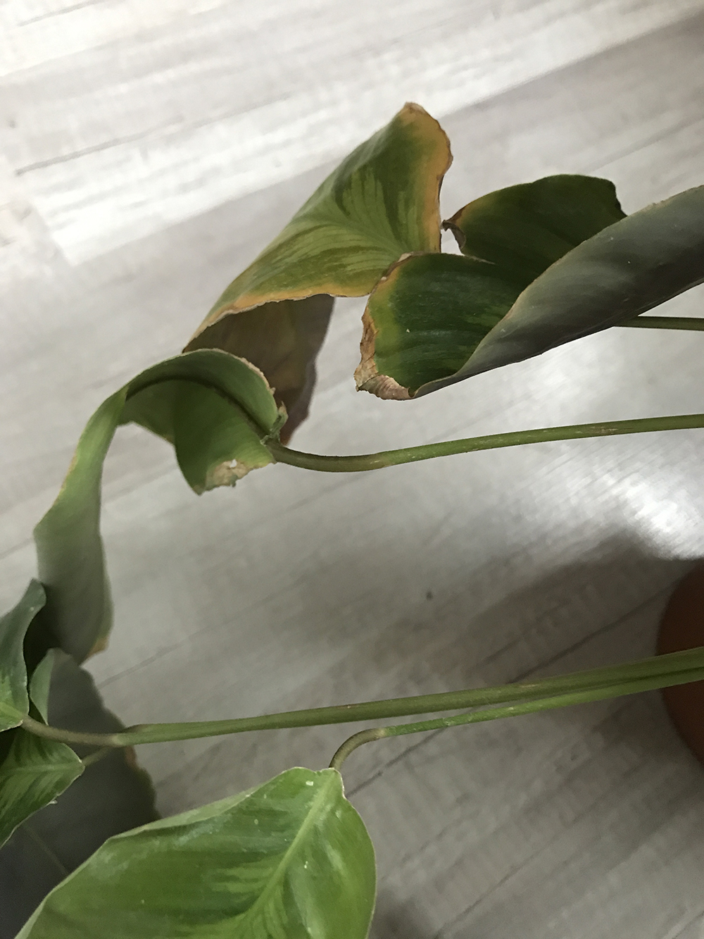 Mes autres plantes semblent avoir très bien vécu le rempotage, mais mon Calathea beaucoup moins… La plupart de ses tiges sont affaissées, comme lorsqu’il a très soif, mais le terreau est encore bien humide, et ça fait déjà quatre jours… Deux d'entre elles se sont d'ailleurs cassées. Deux de ses feuilles sont enroulées sur elles-mêmes. Les tiges ne se redressent plus pour passer la nuit.