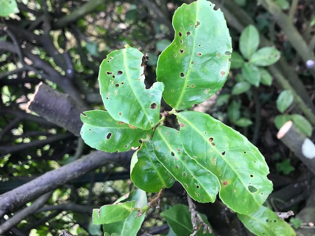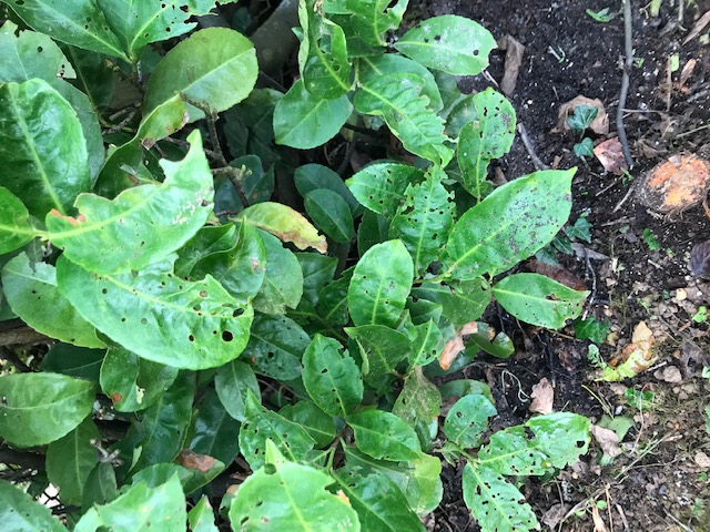 Nous avons remarqué qu'une partie ne poussait plus du tout. En m'approchant, j'ai découvert que les haies étaient en train de mourir : les feuilles sont recouvertes de petits trous, aucune nouvelle pousse depuis l'année dernière (nous avons emménagé en mai).