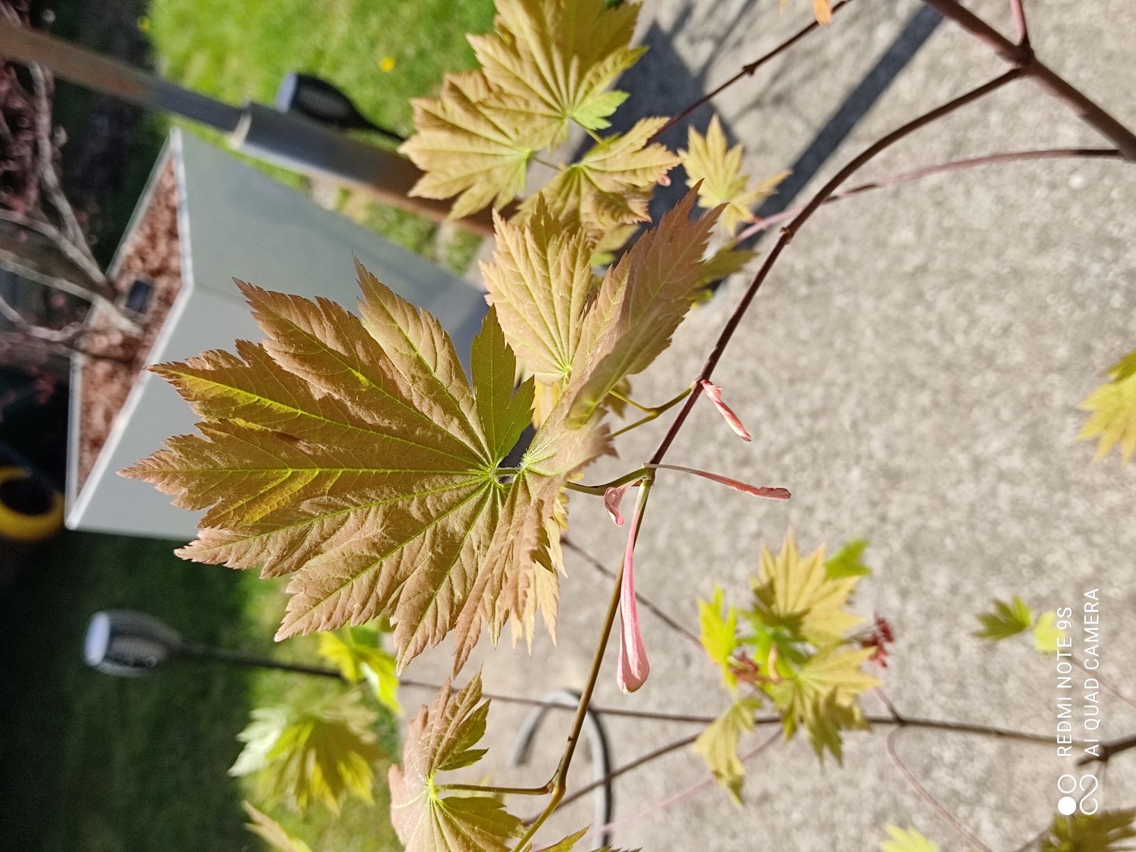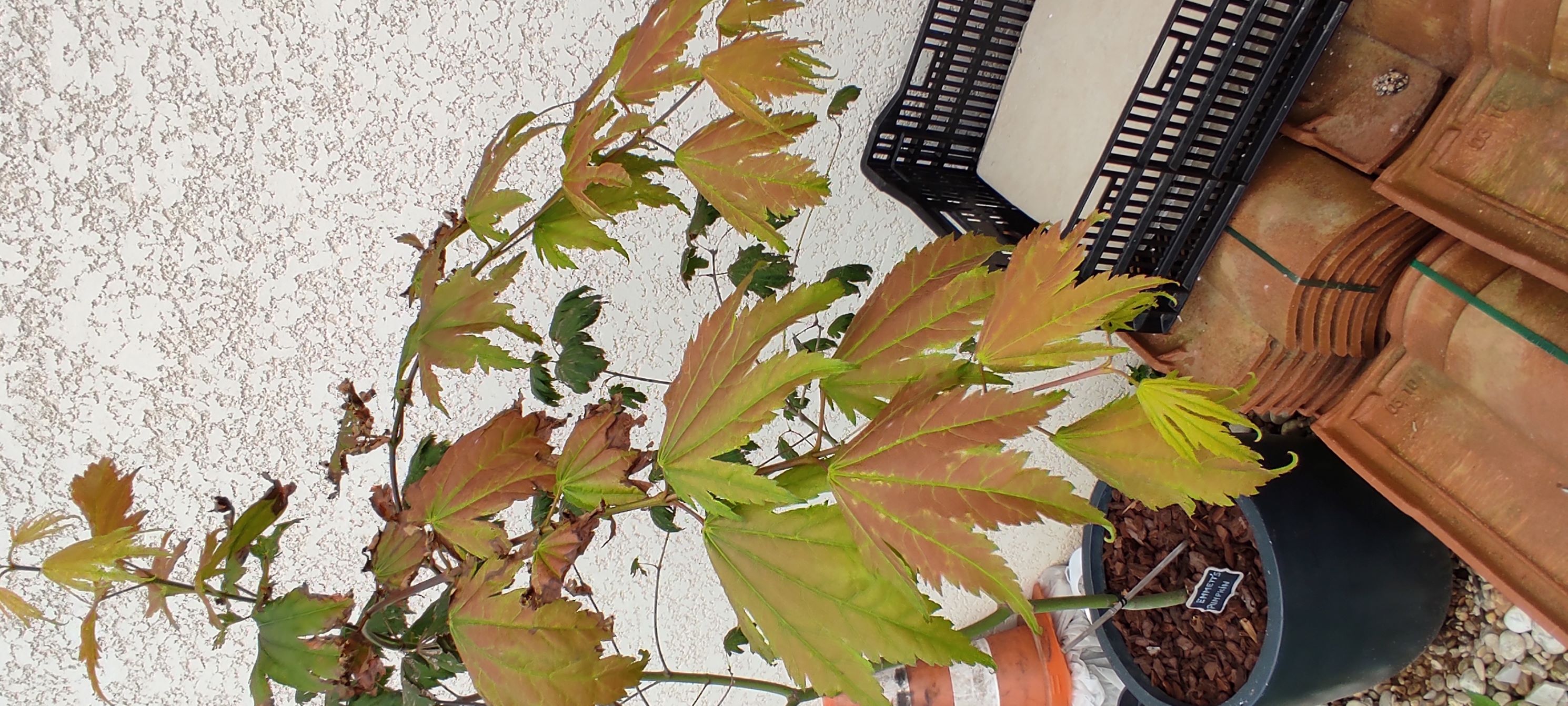 'Aureum' dont j'ai du mettre un tuteur encore plus grand. Une nouvelle pousse moins importante sur 'Beni Maiko' et Katsura. Des bourgeons gonflent aussi sur 'Jordan' et 'Fire cracker'
