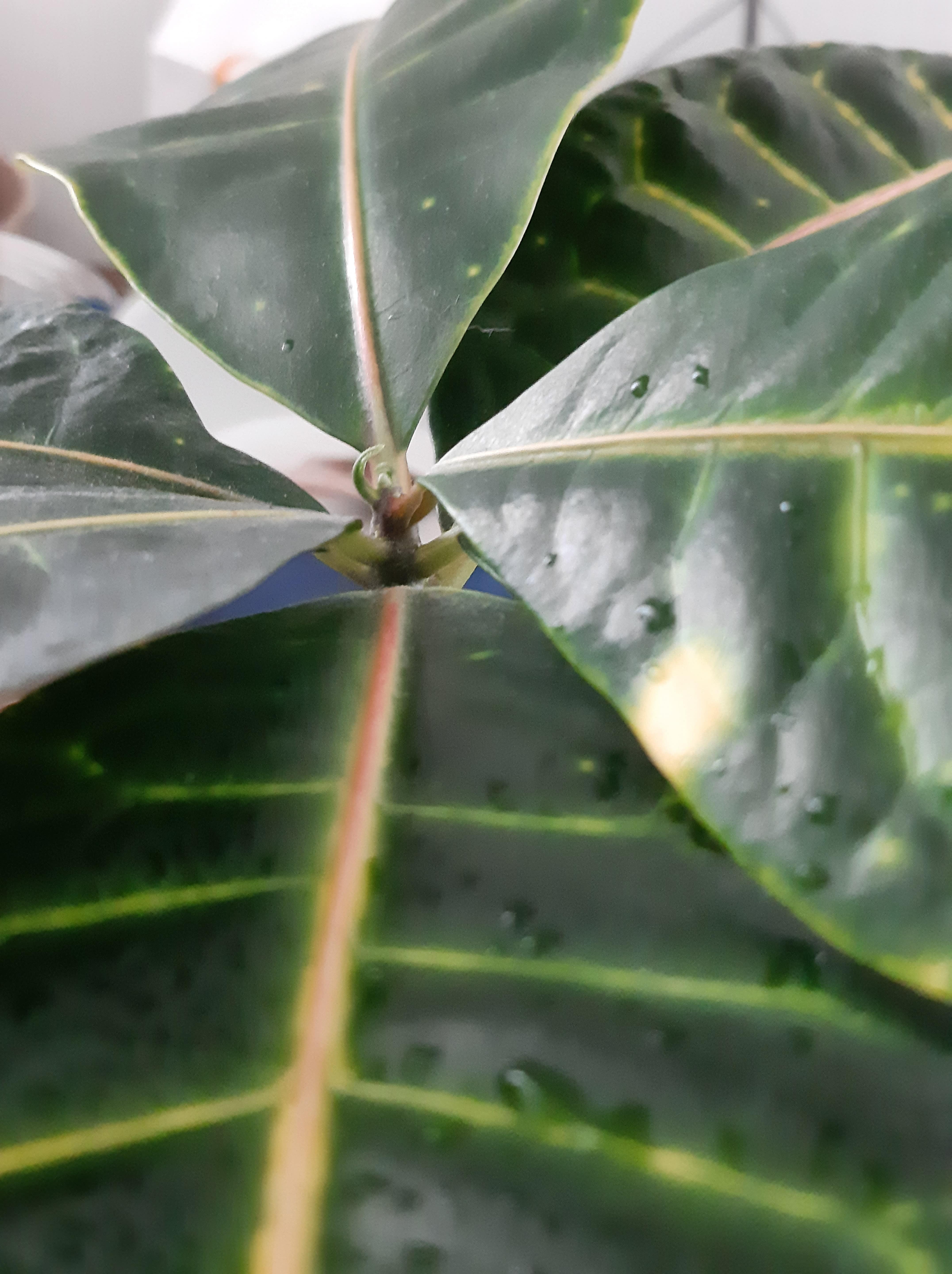 Aujourd'hui, je poste pour la première au sujet de mon croton auquel je tiens beaucoup puisqu'il s'agit de ma première plante, il a 3 ans ! Chaque année il prenait entre 2 et 3 feuilles et cette année il recommence à avoir des petits. (Voir photo n°1).