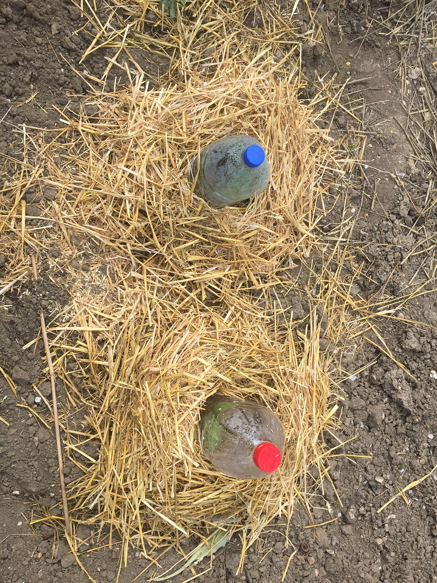 Je reviens ... Juste avant que ça se gatte coté température nocturne et matinale ..., j'avais planté mes pieds d'artichaut (un des trois a fondu dans mon garage pourtant éclairé ?). Je vous poste une photo avec la protection que j'y ai ajouté pour éviter les dégâts du gel, visiblement les bouteilles de 5 litres et la paille ont fait le travail.