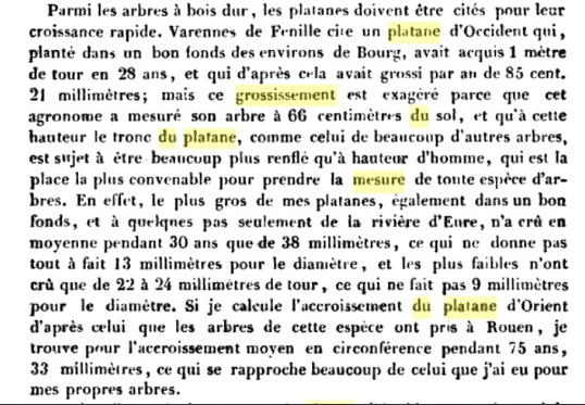 la croissance en bonne condition peut ètre supérieure maintenant qu'à l'époque :il y a le réchauffement climatique et le platane est un arbre de climat chaud et de sol humide ,et maintenant la croissance des arbres est dopée par l'augmentation de la teneur en gaz carbonique. Le seul bémol est que le bois est plus fragile , et il y a aussi l'influence des sécheresses récurrentes