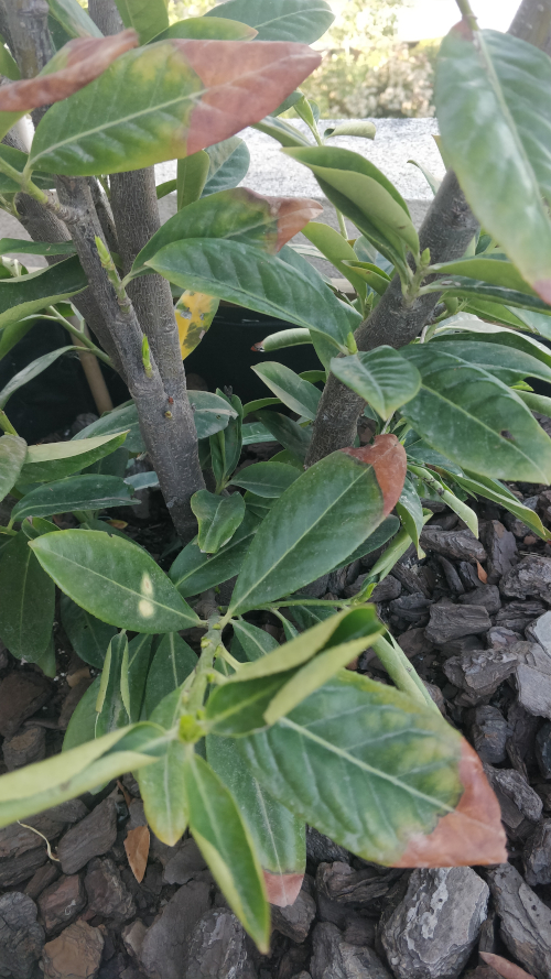 Je m'inquiète pour mes lauriers palmes qui sont en jardinière sur ma terrasse : ils ont perdu beaucoup de leurs feuilles, d'autres feuilles sont à moitié marron. Il y a de jeunes pousses mais certaines sont enroulées sur elles mêmes.