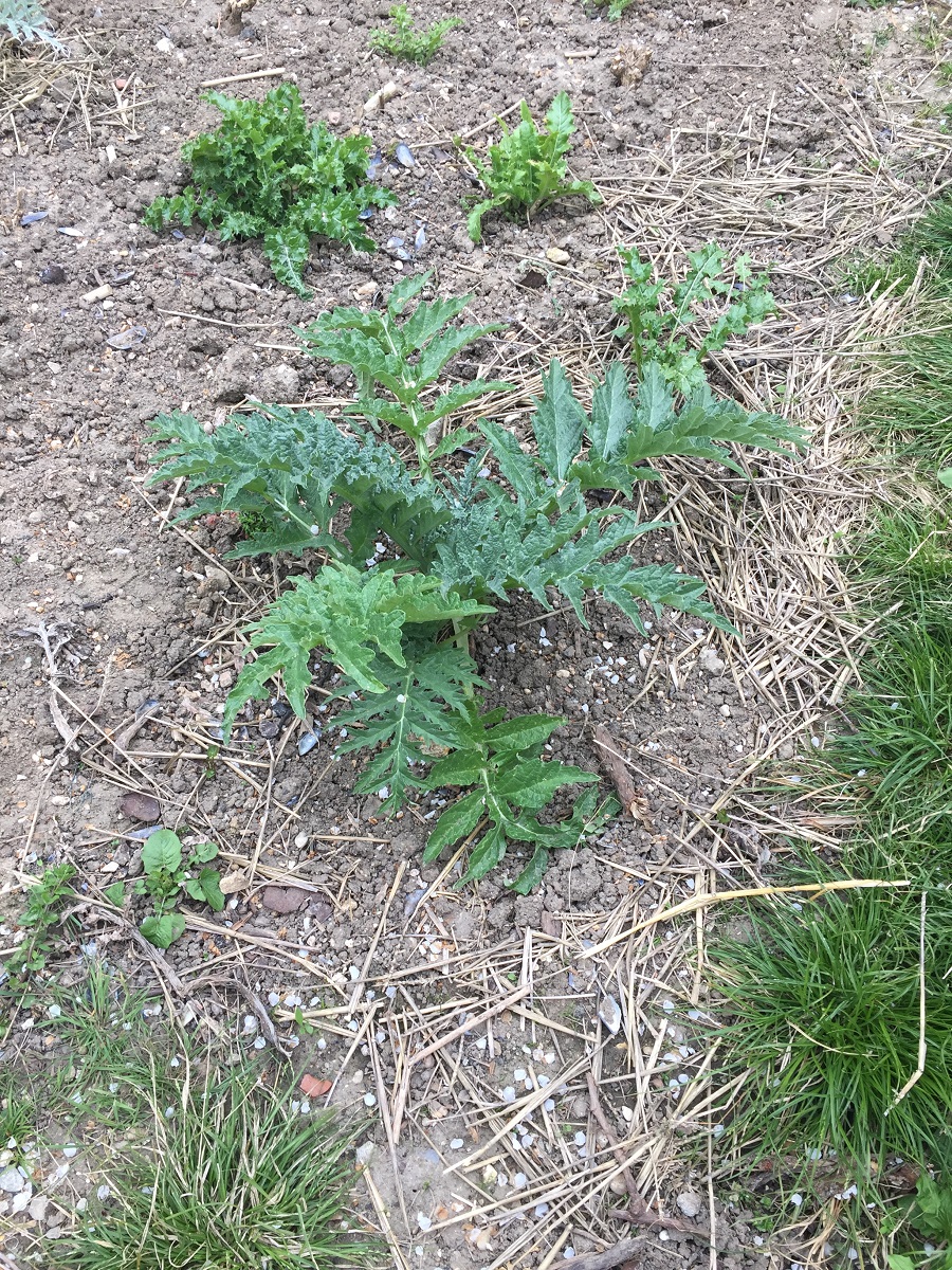 Les cardons, non. Ils sont espacés de 60 cms, je les cuisine tendres vers Juillet et à ce moment là ils ne sont pas trop énormes. Pour les pieds d’artichaut, il faudrait les espacer d’un mètre mais là encore j’ai laissé que 75 cms environ (ça prend trop de place et je le lance à peine ...). Les cardons dans le Couscous ... une tuerie.