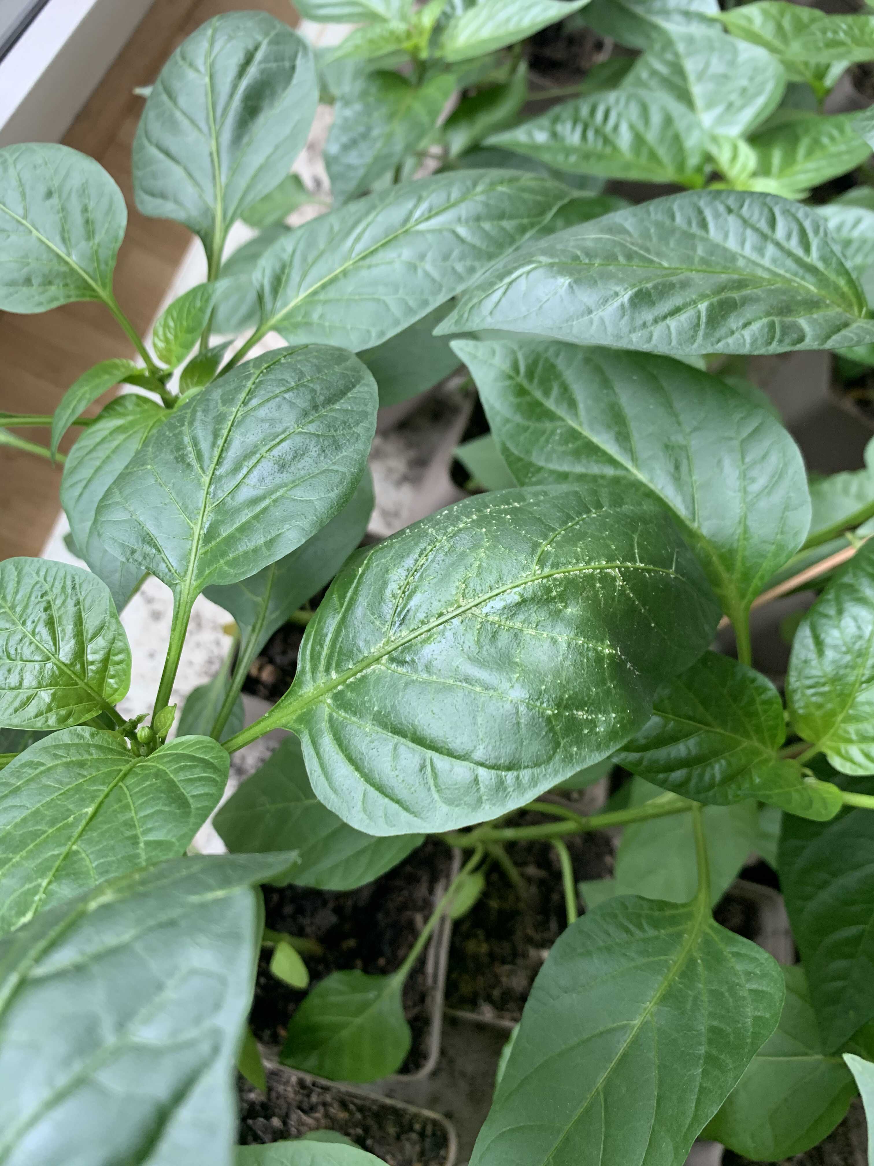 J'ai semé des poivrons et des piments en mars. Ils se sont bien développés, mais sur une variété de poivron apparaissent des petites tâches blanches sur les feuilles. Cela ne semble pas affecter leur croissance, mais je m'interroge : dois-je les mettre en quarantaine, les traiter, qu'est-ce qui peut causer cela ?