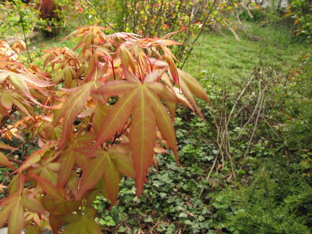 Au niveau des couleurs, il est très précoce et debourre dans les premiers avec katsura. Ses couleurs de printemps chez moi sont assez ternes, d'un orange vin assez uni. Mais il garde cette couleur assez longtemps et prend en été un beau vert olive lustré aux nouvelles pousses un peu jaune orangées. A l'automne il est vraiment d'un beau rouge feu. Je n'ai pas observé la couleur décrite par maillot.