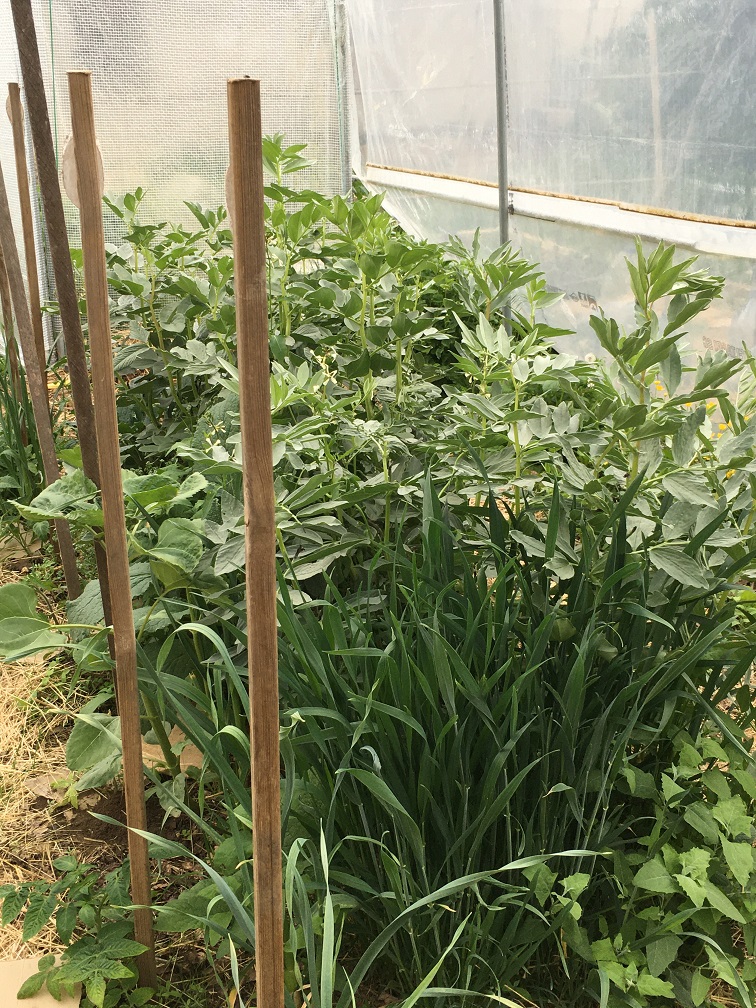 Les fèves sont entourées de pousses d'aillet et du blé des oiseaux qui a été versé par mégarde !!
