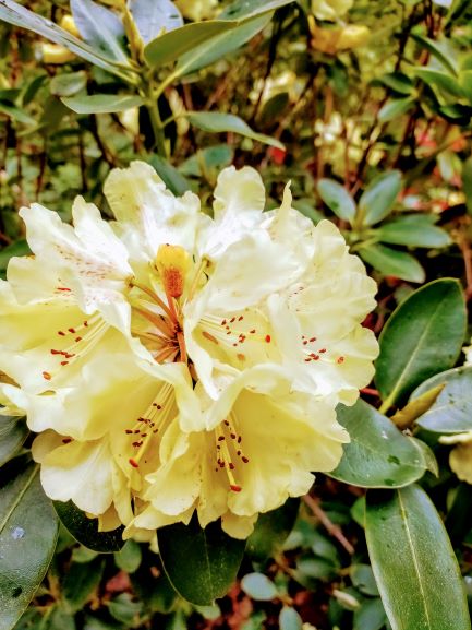 bonjour , un ami propriétaire d'un arboretum situé à 800m d'altitude en Auvergne me demande d 'identifier ce rhododendron à port étalé et portant en ce moment des FLEURS JAUNE CITRON PALE
