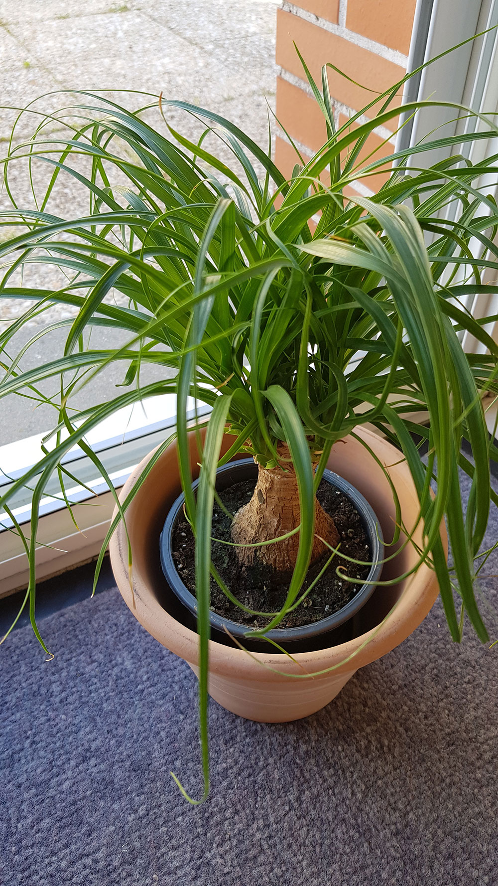 Le Beaucarnea n’a pas besoin de plus grand. C’est une plante qui aime assez être à l’étroit et ça évite de la noyer. A la limite il n’a pas besoin non plus d’un rempotage, quoi que le substrat ait croûté en surface.