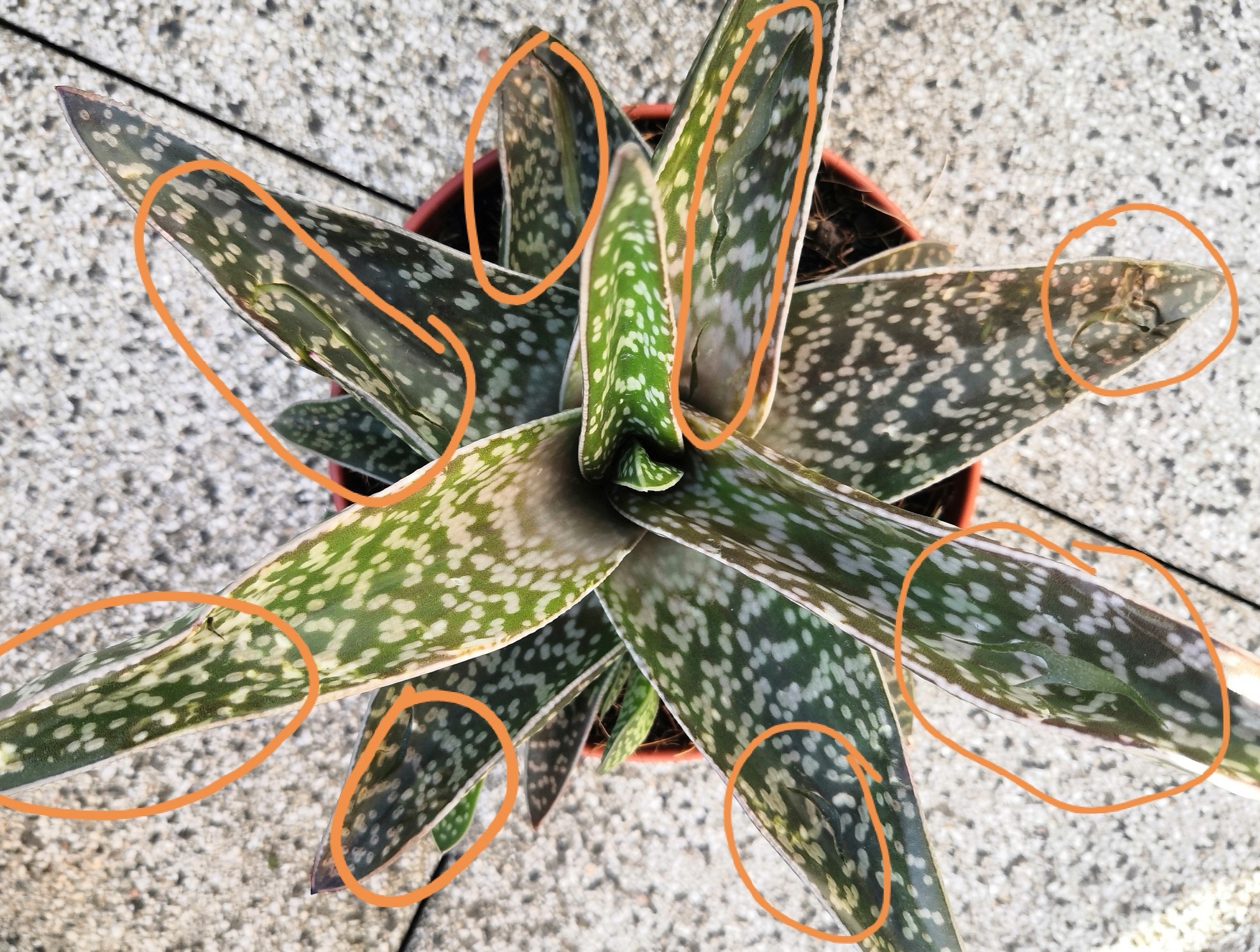 Par contre, je viens de réaliser que mon Aloe Variegata a été littéralement percée de partout. Presque toutes les feuilles sont éventrées et desséchées (cf. Photos).