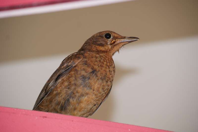 Juvénile de merle noir (roussâtre, moucheté et commissures).