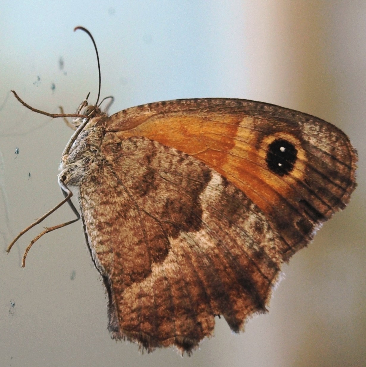 Un Coenonympha pamphilus, le Pamphile se mire dans le double vitrage