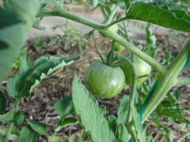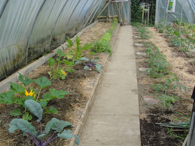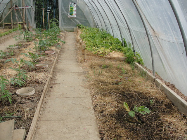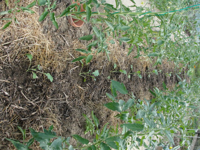 au centre: une ligne de 14 tomatiers // EV mis en couverture plus paille et orties entre les tomatiers
