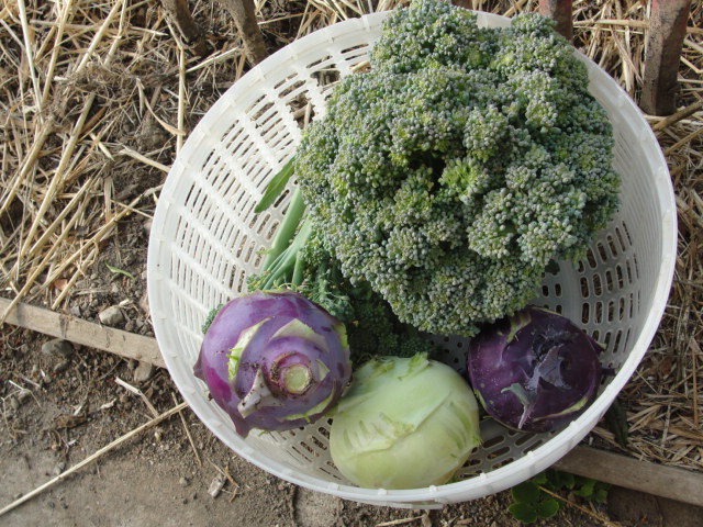 Dans le tunnel où se concentre toute mon activité actuellement, je récolte choux-fleur, brocolis, concombres, choux-raves, carottes, pommes de terre, salades à tondre. Suffisamment de variété pour deux personnes chaque jour.