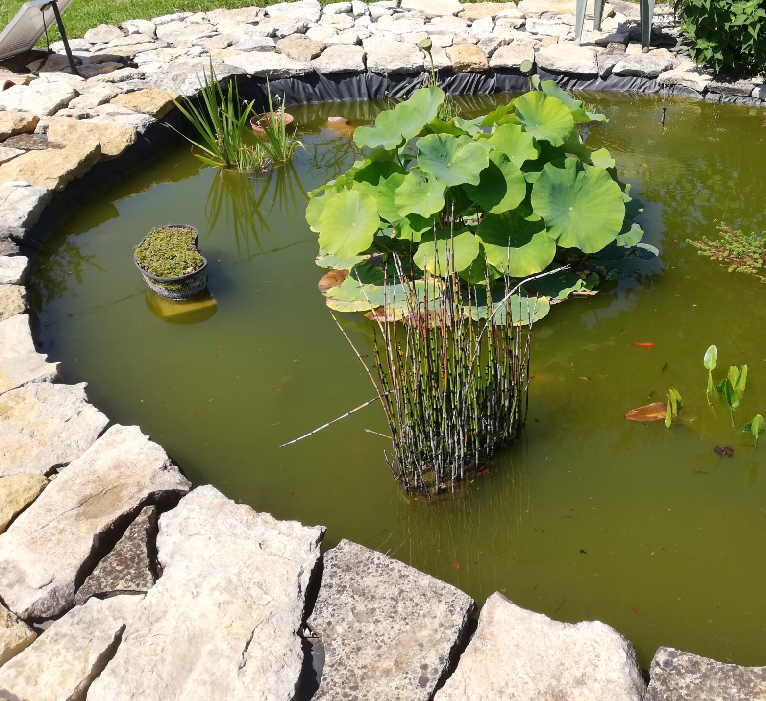 Bassin d'environ 2 500 L mis en service en Mai 2011, agrandi en juillet 2020 pour environ 12 M3 sans filtre avec fontaine solaire de 1 700 L/h.