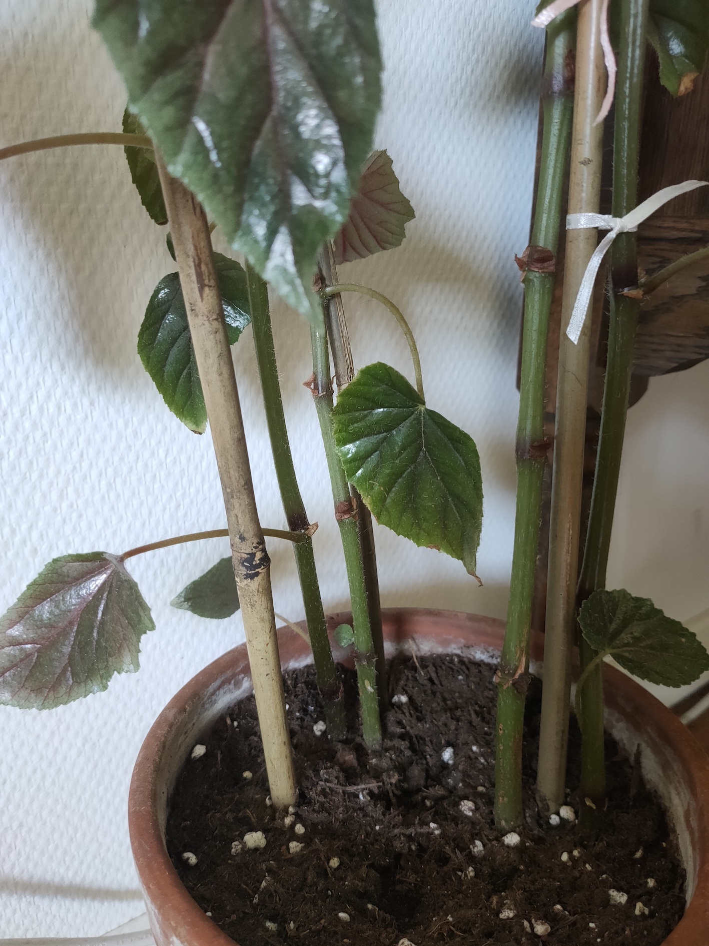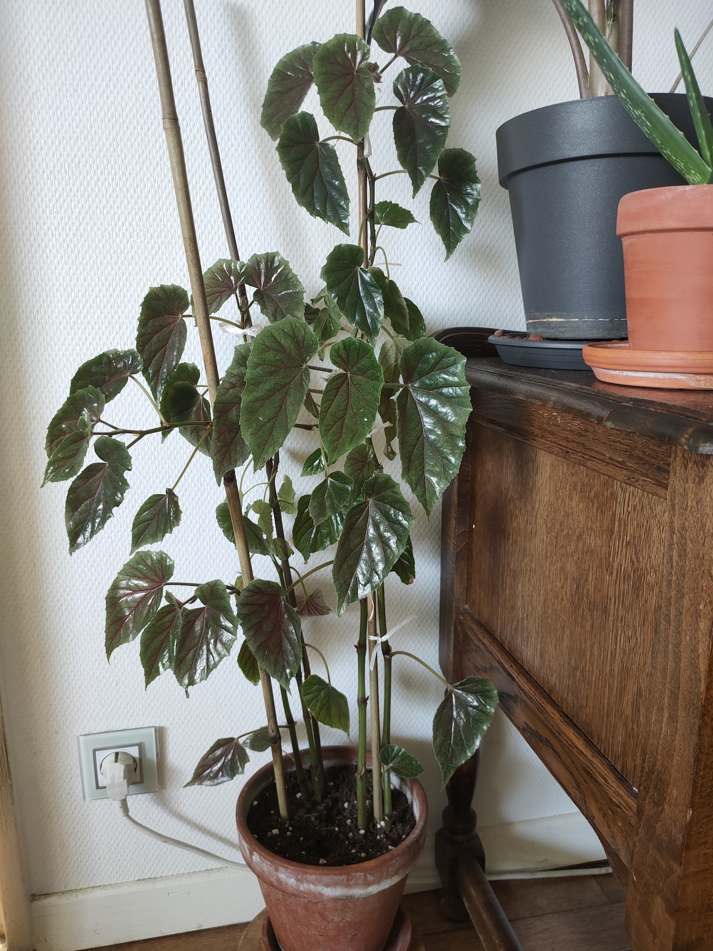 C’est bien un Begonia. Je ne saurais dire quelle espèce ou cultivar mais il est bambusiforme, très probablement plus adapté à l’intérieur que l’extérieur. Son pot n’est pas trop petit, il est même un peu trop grand amha ; les bégonias n’ont pas besoin de grand pot car leurs racines sont fines et assez courtes, elles craignent les sols longs à sécher donc pot pas trop grand ni trop profond.