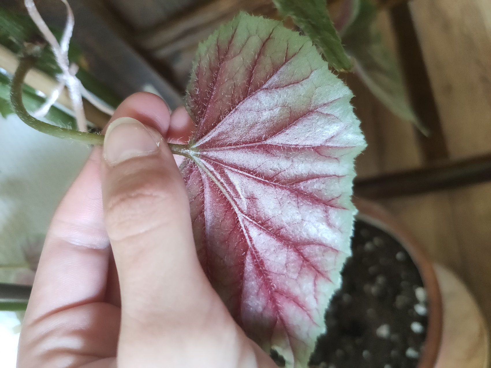 Les feuilles présentent quelques petits "fils" à la surface que ce soit devant comme derrière.
