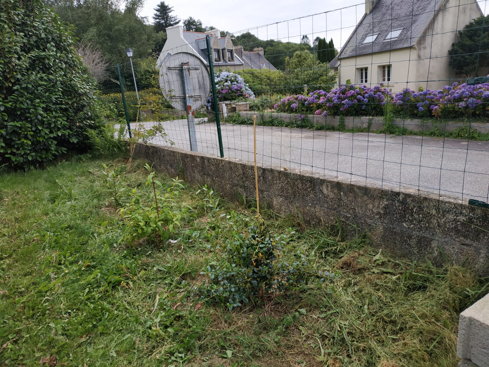 De toute façon vu le « chemin » de bitume, il y a certainement des conduits et tuyaux là dessous. Si oui ça doit rester facilement accessible à tous travaux, donc pas de grosses plantations.