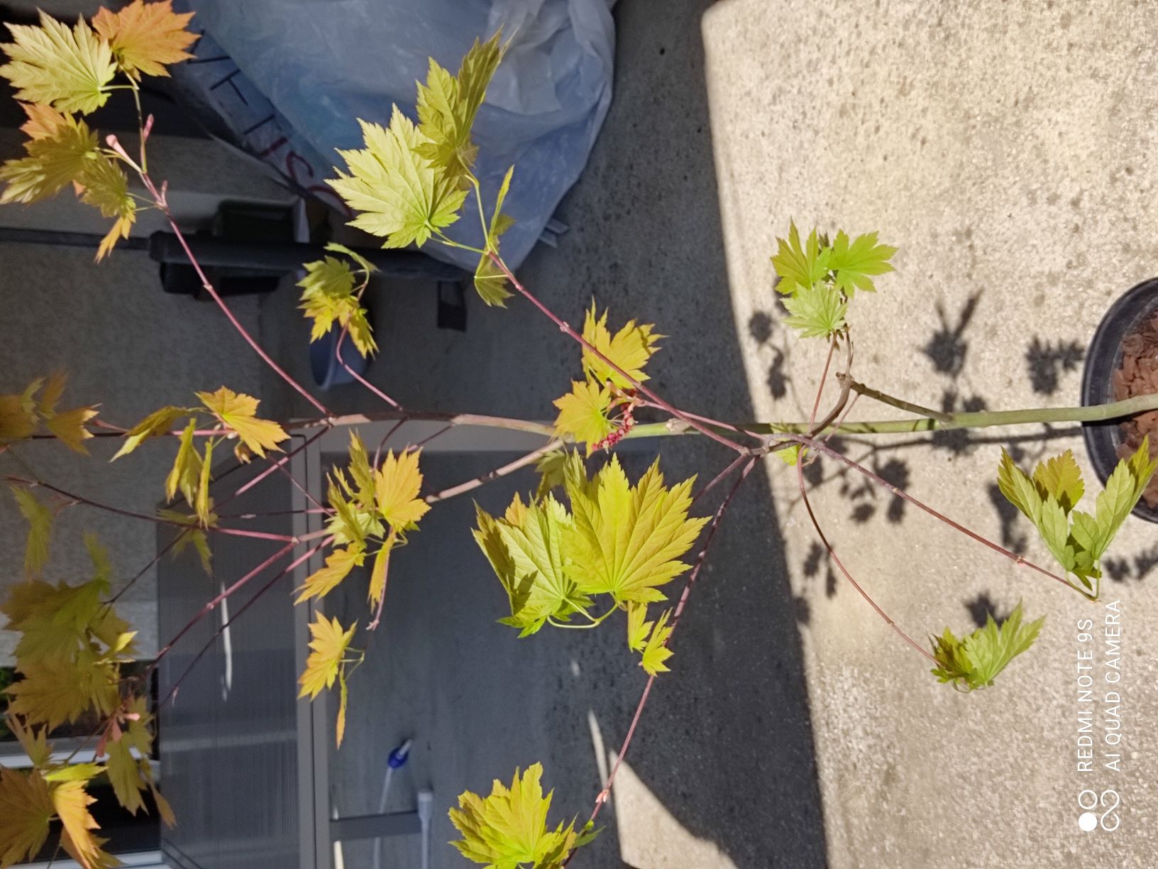 'Aureum' dont j'ai du mettre un tuteur encore plus grand. Une nouvelle pousse moins importante sur 'Beni Maiko' et Katsura. Des bourgeons gonflent aussi sur 'Jordan' et 'Fire cracker'