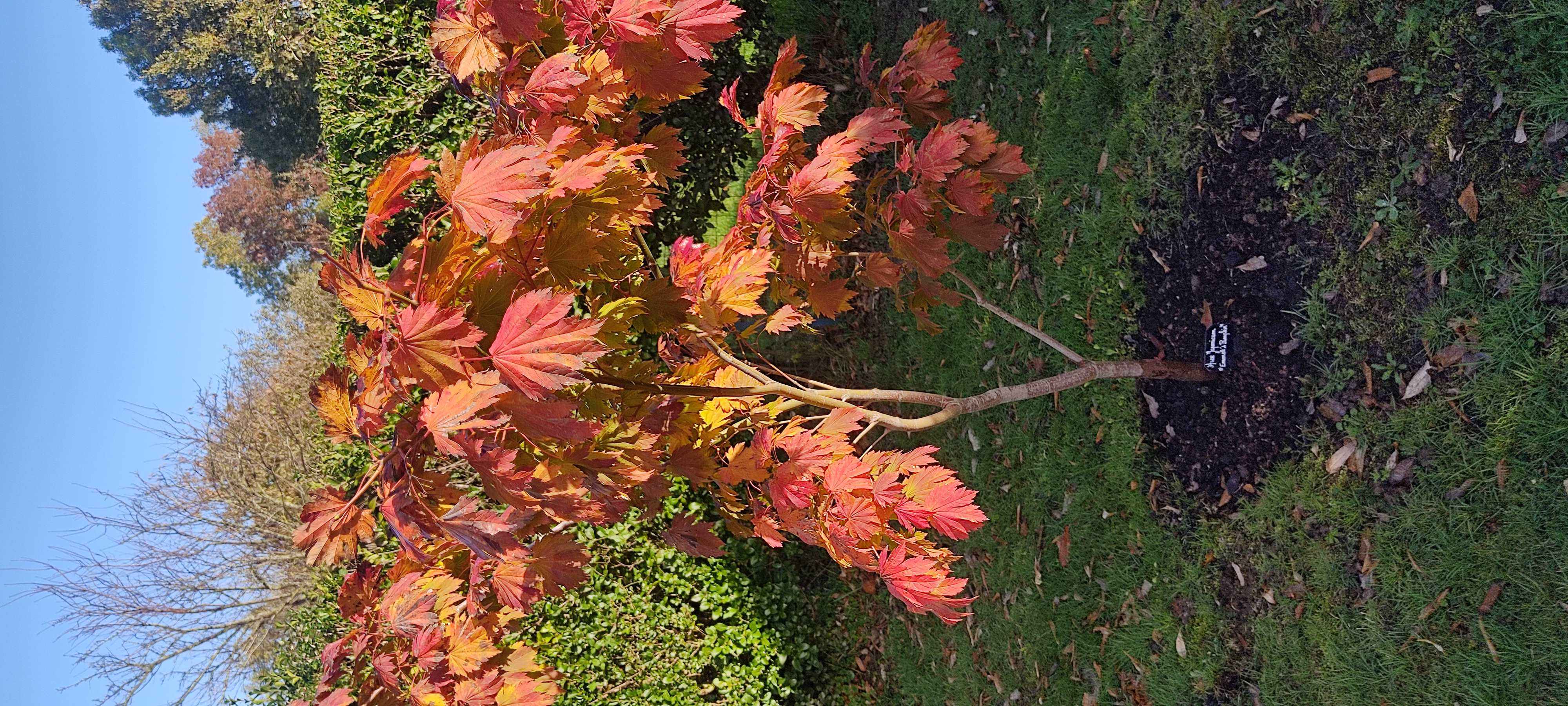 En Automne les grandes feuilles virent en orange foncé avec des nervures rouge.