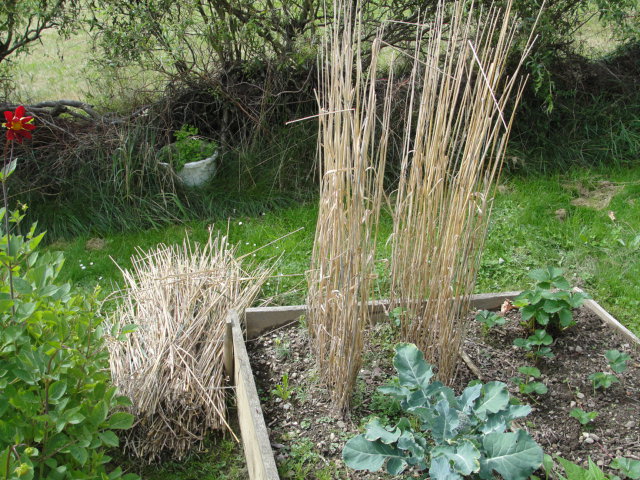 Après j'ai étendu des roseaux de Chine recouverts de foin entre les lignes de choux, de carottes et de haricots.
