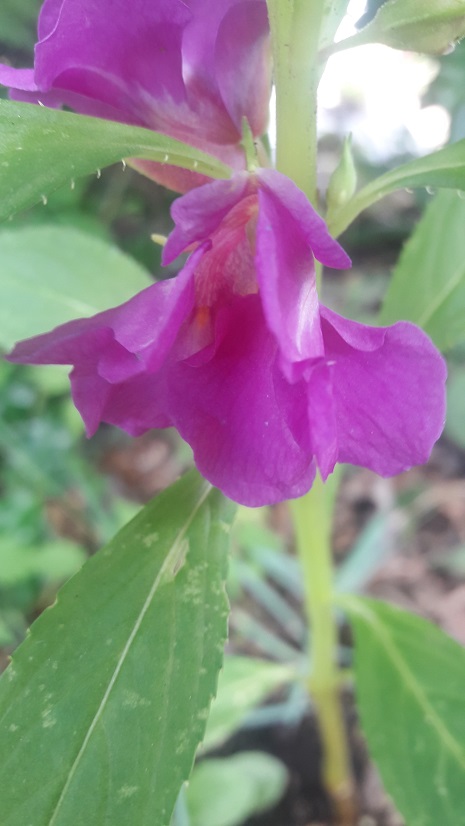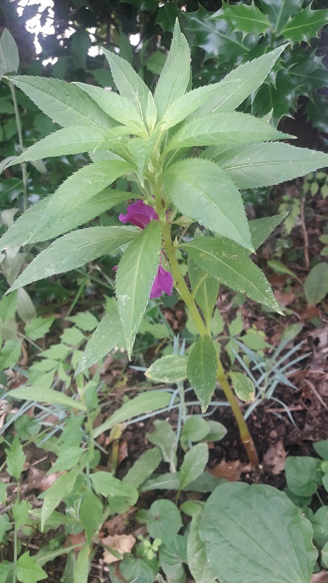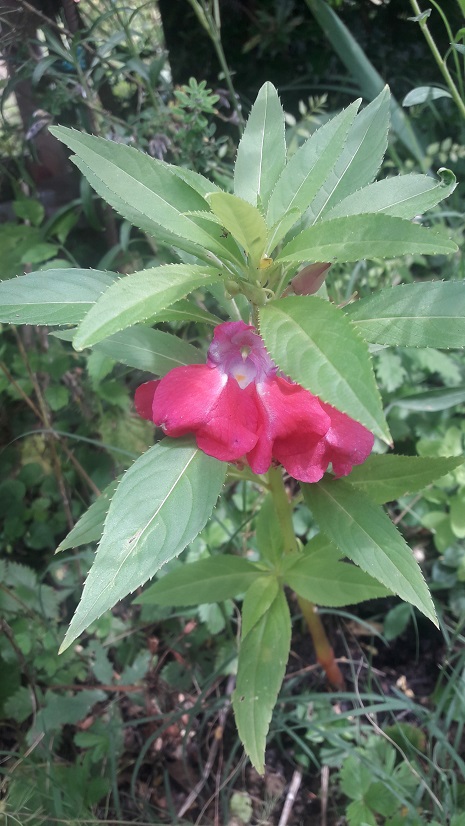Dans la même veine, un mois plus tard (courant juillet), j'ai ces fleurs qui sont sorties. Elles se cachent toutes sous leurs feuilles. La plante fait 20-30 cm de hauteur, divers coloris, du rouge au violet.