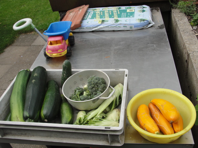 Récolte du jour: courgettes vertes et fenouils du potager, jets secondaires de brocolis, concombre et courgettes jaunes de la serre (qu'il faudra éplucher).