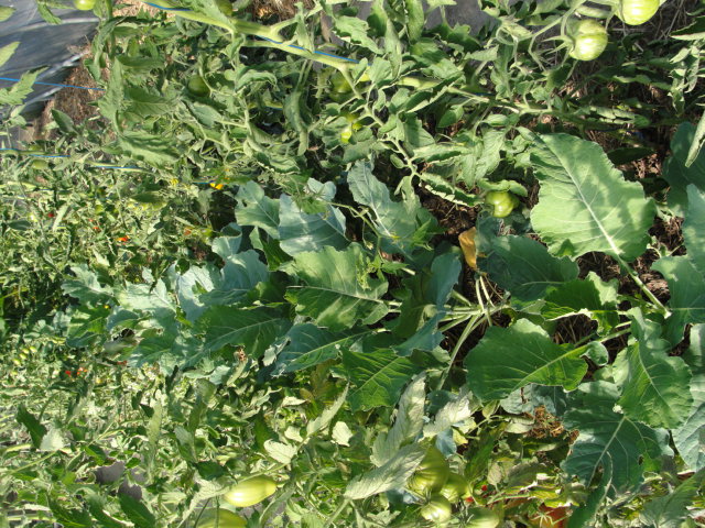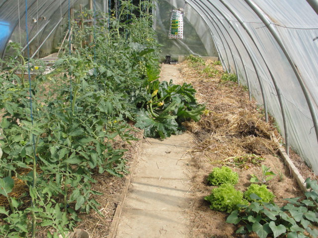 au centre: une ligne de 14 tomatiers // EV mis en couverture plus paille et orties entre les tomatiers // 12 brocolis et une courge plantés dans l'interligne