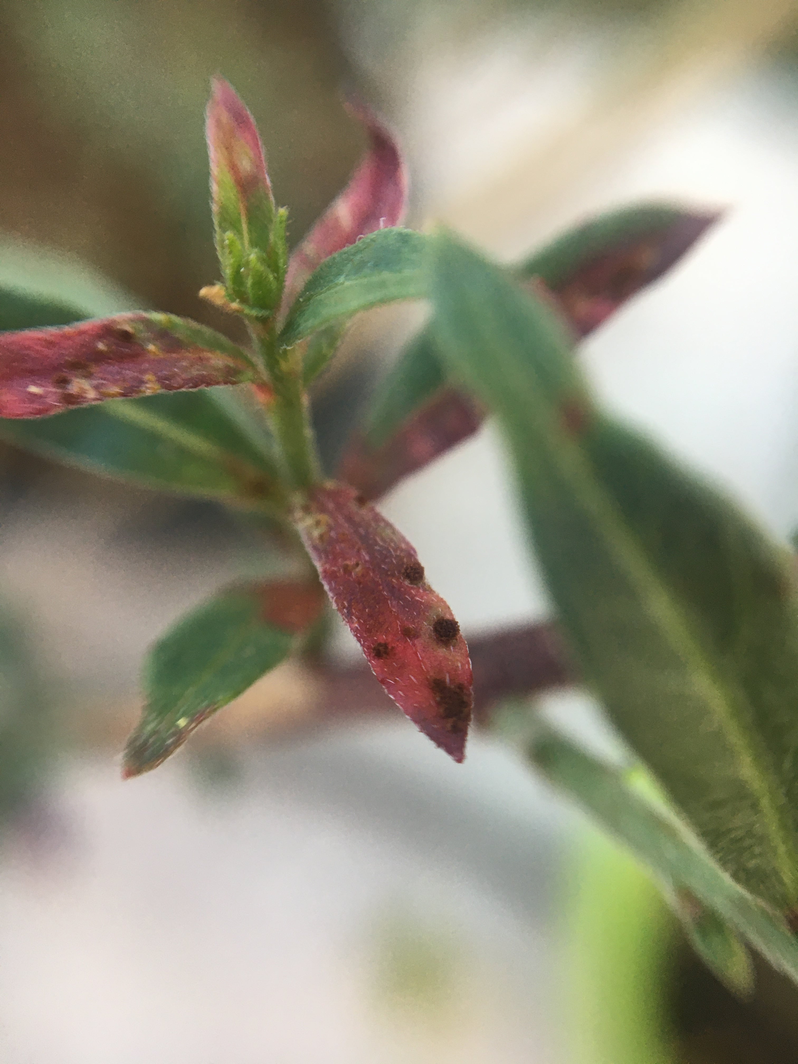J’ai déjà lu qu’il est normal de voir des taches pourpres sur des Gaura, mais je me suis aperçue que non seulement la plante était pourpre à certains endroits sur les tiges et les feuilles, mais qu’elle comportait aussi des taches volumineuses des deux côtés de ses feuilles, et qu’en les touchant, la partie volumineuse est poussiéreuse et tache les doigts, comme un pigment.