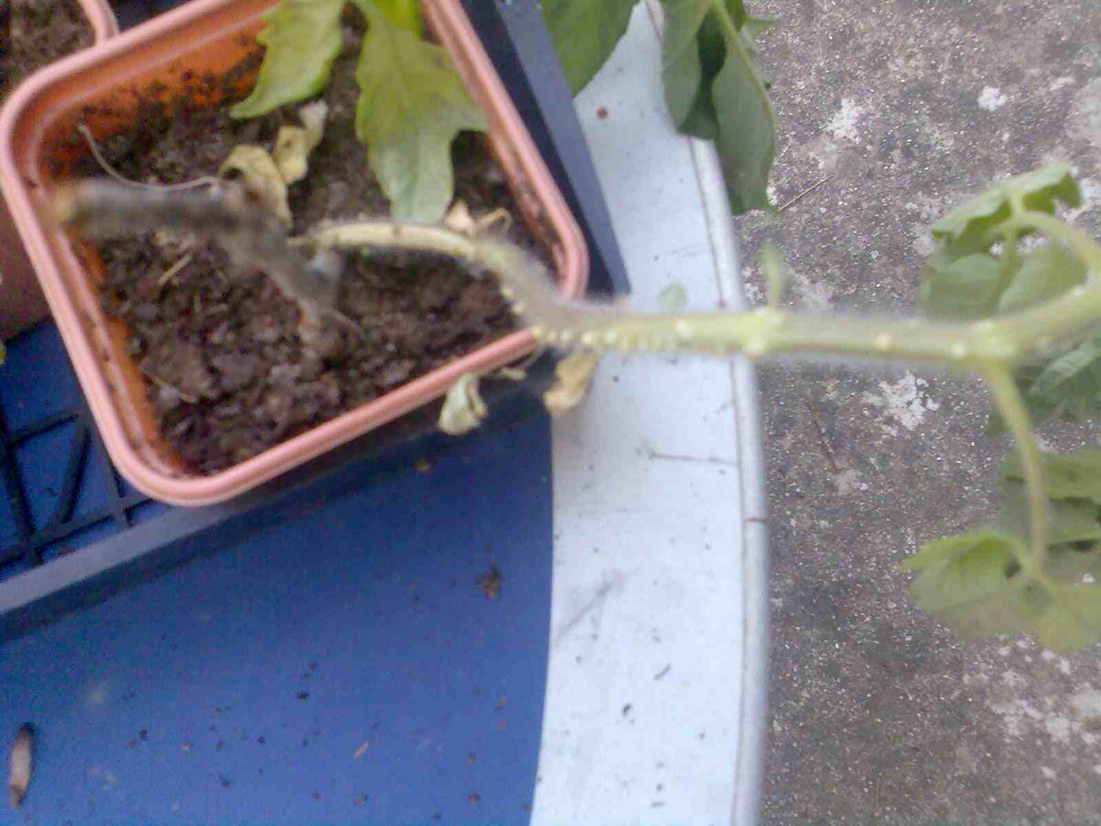 Je ne sais pas si l'envoi de la photo marchera, mais j'ai ces bubons berks qui sont apparus sur les pieds de tomates (qui sont encore en pots), ce sont des tomates bios de Ste Marthe. a priori ça doit être de petits parasites, non? ou une maladie. M'enfin je me demande quoi faire. ça se soigne, docteur?