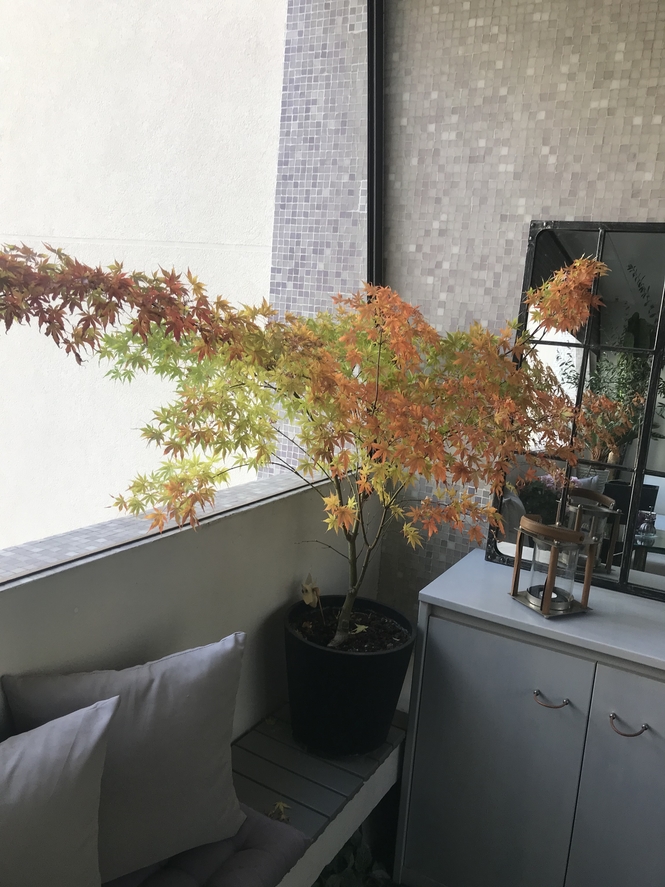 on vient d'emménager dans notre nouvel appartement et j'ai tenu a garder les plantes qui y étaient déja sur le balcon. Notamment cette belle plante (érable du japon peut être) qui est sur le balcon face soleil (environ 3h par jour). Ses feuilles ont entamés le changement de couleur automnale mais je n'ai toujours pas une identification a 100%.