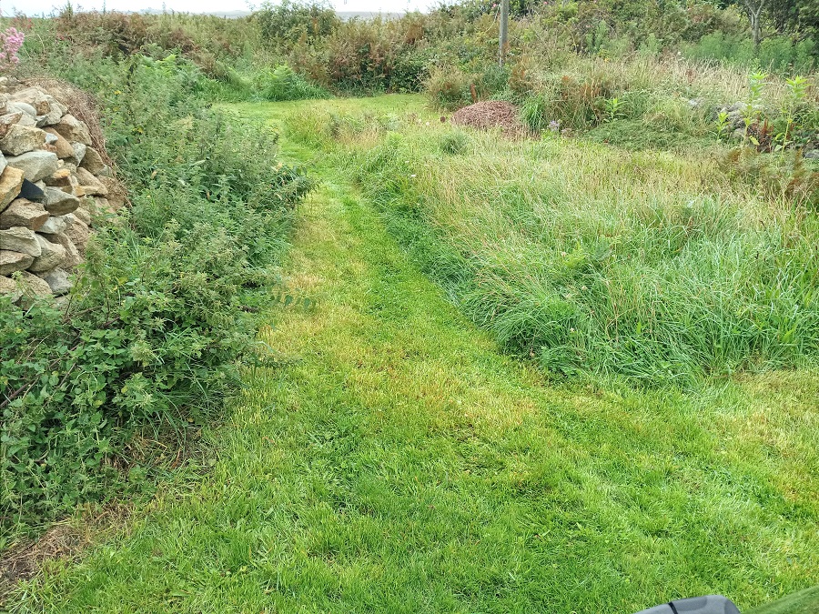 Et enfin, comme Marcol je pratique la tonte différenciée : un petit passage pour passer à pieds secs les jours de pluie ou les matins de rosée, et de la place pour les insectes et les plantes sauvages (j'attends l'automne que les graines soient dispersées pour faucher).