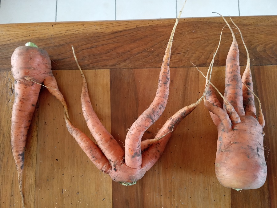 Pour les carottes bizarres ça peut être un stress hydrique (arrêt et redémarrage de la pousse)