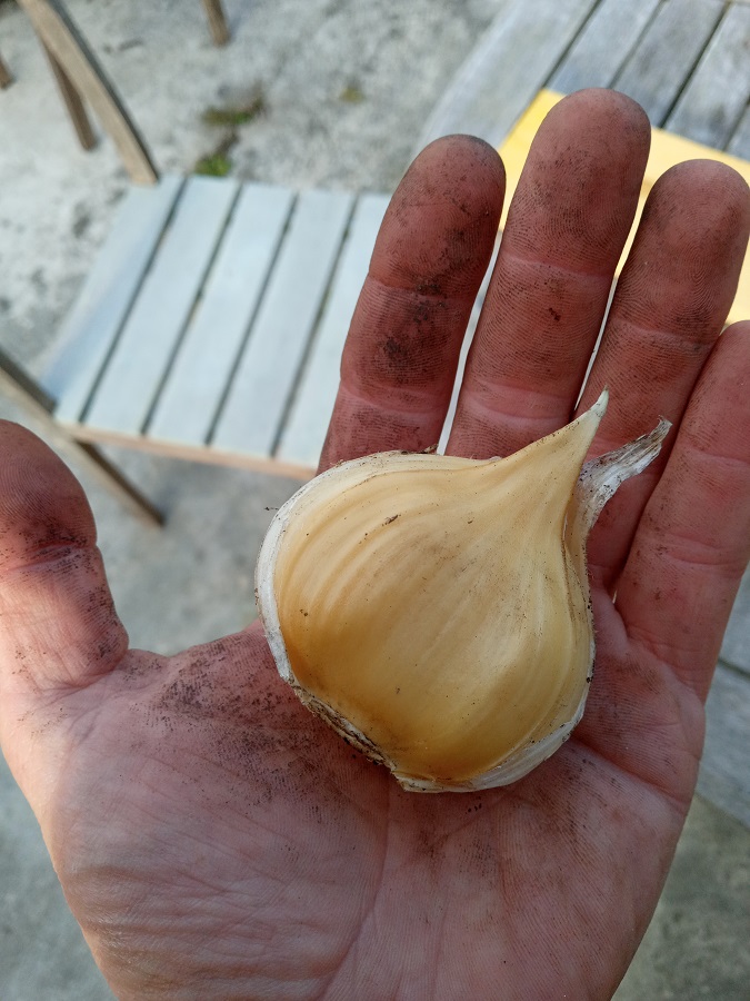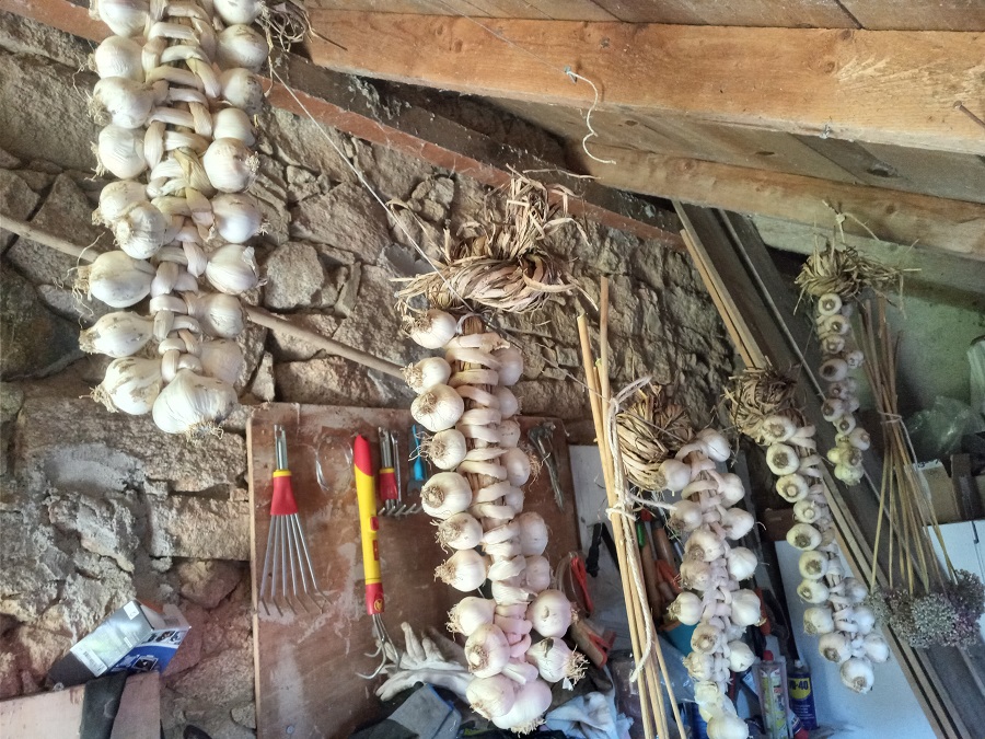 Pour l'ail, ça a été une bonne année en terme de production mais je m'inquiète pour la conservation : il a fait très humide/pluvieux pendant plusieurs semaines au moment de récolter, j'ai déjà quelques gousses qui commencent à pourrir...