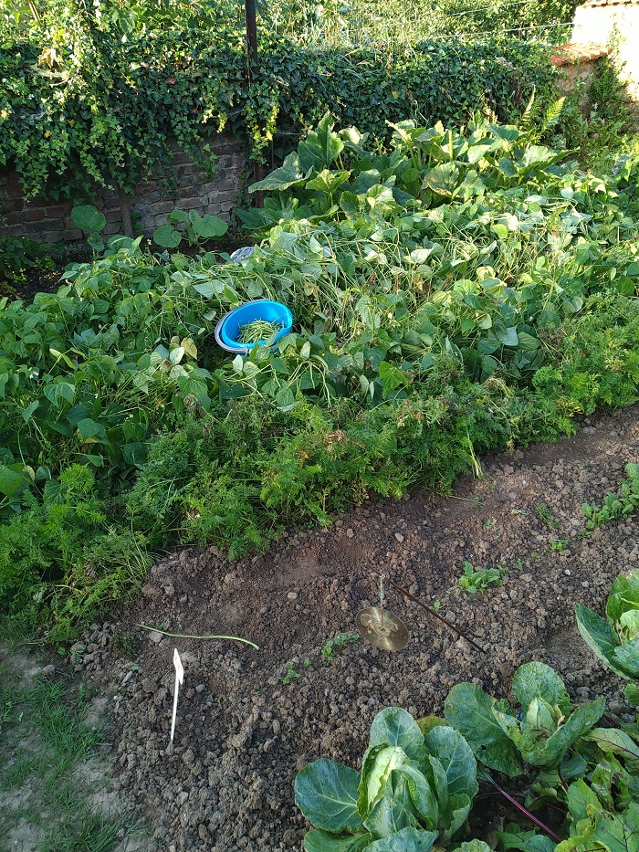 Première cueillette de haricot au petit potager . Un bel enchevêtrement de haricots extra fin, une variété inconnue Bonduelle, Semi des champs et pas du tout nain comme d'autres années :?